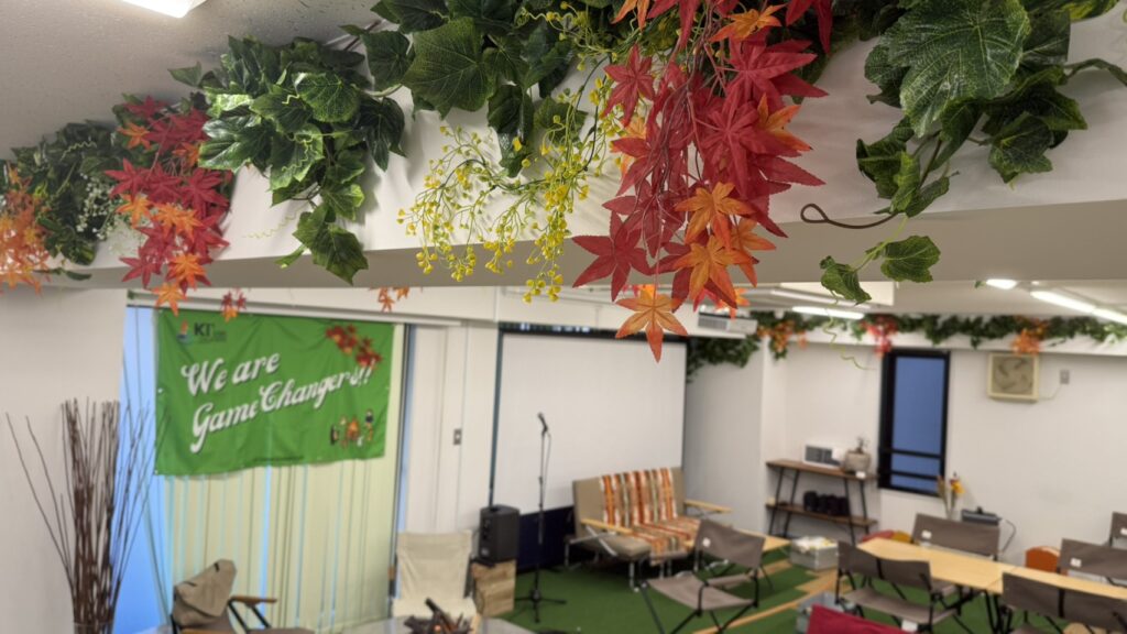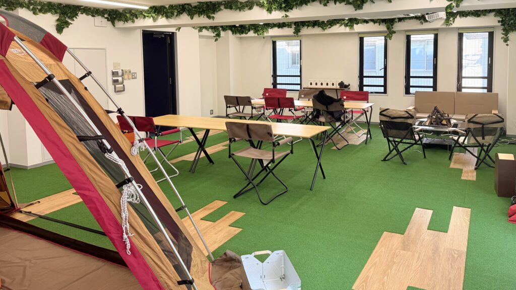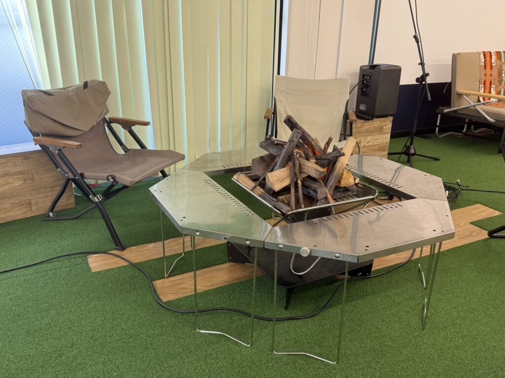 まるでキャンプ場の開放感を感じながら、焚き火を囲むように人が集まり、アイデアや議論が生まれる場。