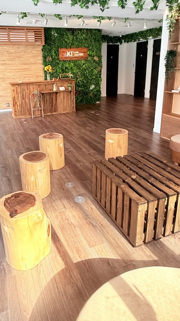 切り株をイメージしたソファと森の木をイメージした本棚。
